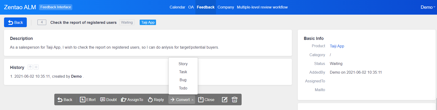 ZenTao Feedback can be used for after-sales and technical support of delivered products. You can set the company's internal personnel, such as customer service as Feedback users in ZenTao, to submit customer feedback questions and opinions. Developer users can directly reply, forward requirements, and forward bugs based on the questions submitted.
