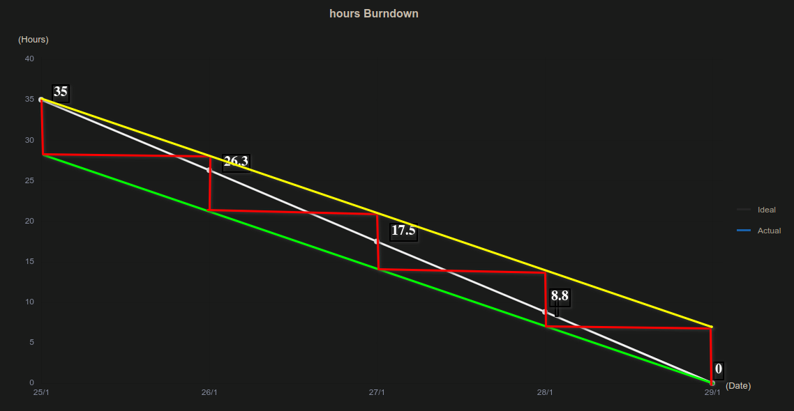 The red line represents how the actual time would move each day, e.g. on Jan 25, we finish one task (7h) so at the end of the day it is at 28 hours. Then in the morning on Jan 26, no task done yet, we start with an actual of 28 hours, then in the evening of 26. after the second task finished (7 hours), we end at 21 hours.