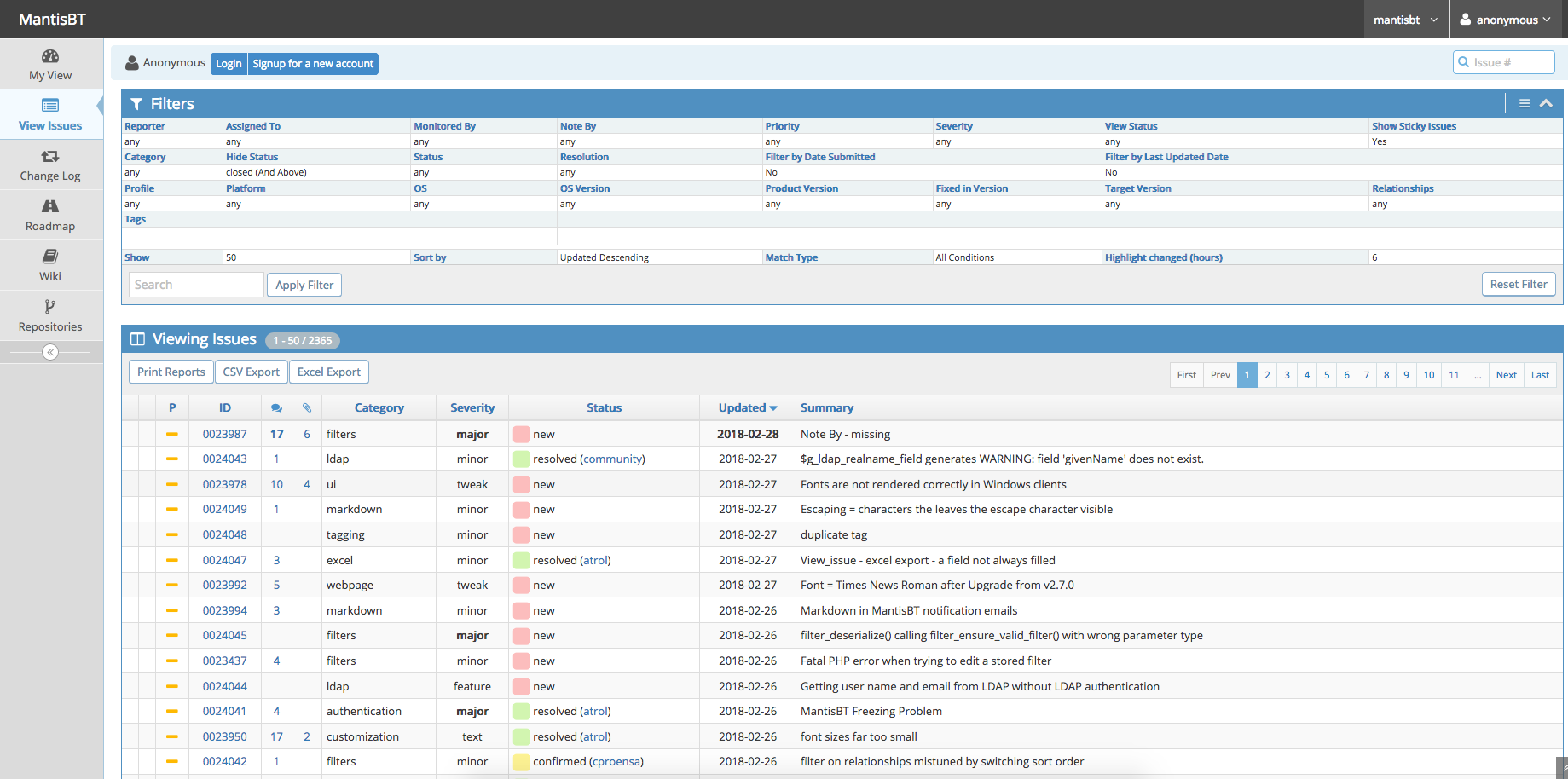 MantisBT is an open source issue tracking system that gives a balance between ease of use and capabilities. Some of the key features include email notifications to keep your team informed, control which users see which projects and customizable workflows. MantisBT is built on PHP (hypertext preprocessor) and is compatible with MySQL and PostgreSQL databases. Although it is a bug tracker, it can also be used to manage larger software development projects.