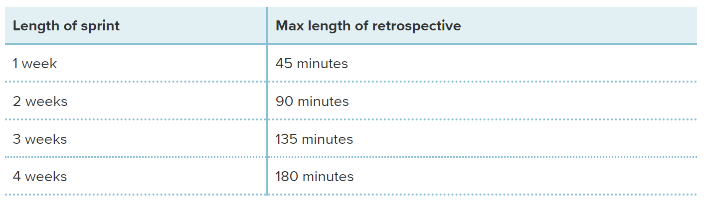 A good rule of thumb is to keep your sprint retrospectives to no longer than 45 minutes per week of the sprint. That means a one-week sprint would have a sprint retrospective of maximum 45 minutes, while a month-long sprint could take up to 3 hours.