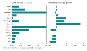 Whereas the amount of content about the React framework was essentially unchanged (up 2%), there was a significant decrease in content about the Angular framework (down 16%). The amount of JavaScript is almost the same as that of React. Rails content decreased by 19%.
