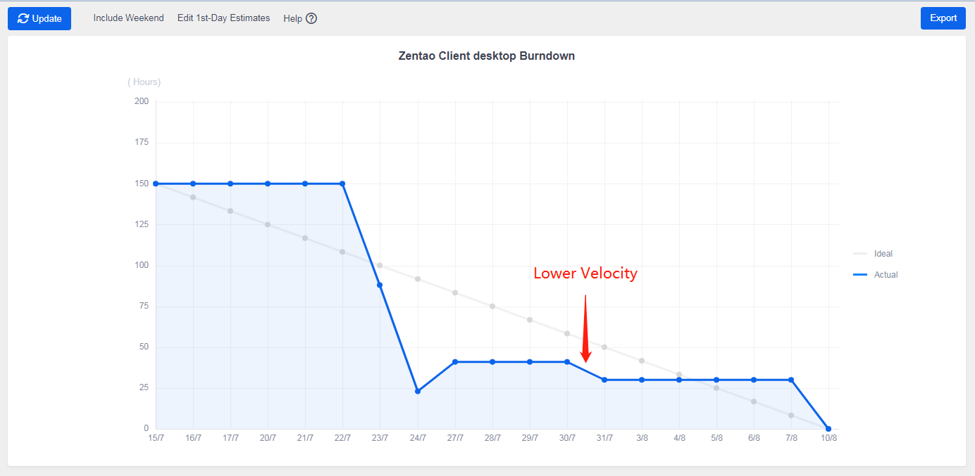 The line in the burndown chart can tell you when the team velocity is lower, so it is also the time that the Scrum Master needs to step in and see what holds back the team. A burndown chart can tell more than that. Read Burndown charts and the stories it can tell for how the team is doing in a project