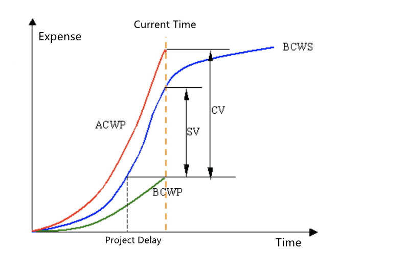 CV, cost variance, cost deviation, CV = EV-AC.