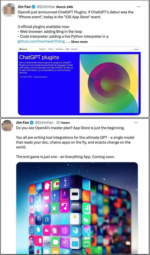 In response to OpenAI's move, Nvidia's AI scientist Jim Fan said on his personal social media platform: If the introduction of ChatGPT was "the emergence of the iPhone", then today (the launch of the plug-in feature) is "the iOS App Store "The event. In a later tweet, he said that the "App Store" is just the beginning and OpenAI's master plan is to make "an app that has everything", and that day will come soon.