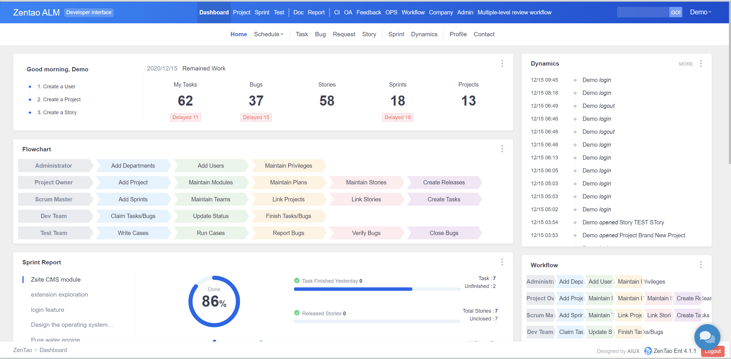 The main management ideas of ZenTao project management software are based on the internationally popular agile project management method-Scrum. Scrum is a pragmatic agile project management method, but as we all know, it only specifies the core management framework, but the specific details need to be expanded by the team. On the basis of following its management method, Zen Tao incorporates many requirements of the status quo of research and development, such as bug management, test case management, release management, document management, etc. Therefore, ZenTao is not only a scrum agile project management tool, but also a complete project management software. Based on scrum, but not limited to scrum.