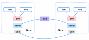 There are several different implementations of pod communication among different nodes, including the common flannel vxlan/hostgw mode, which uses etcd to learn about other nodes' networks and create routing tables for this node, enabling cross-host communication among different nodes.