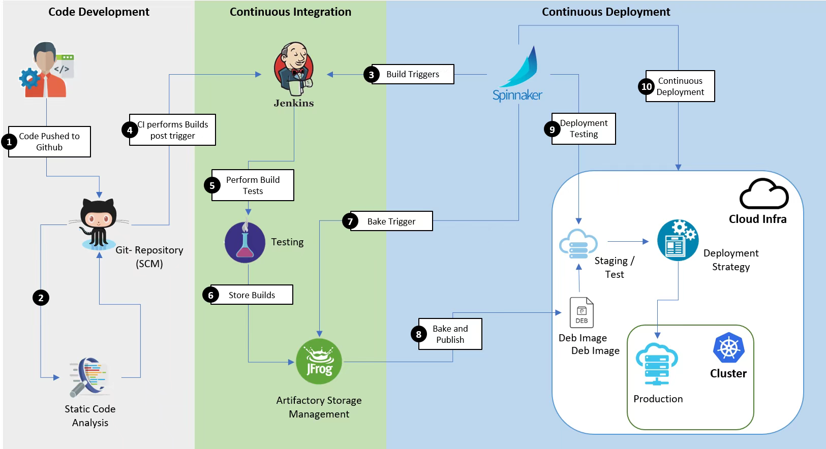 Continuous integration (CI) is building software and completing initial testing. Continuous deployment (CD) combines code with infrastructure, ensures that all testing is completed and policies are followed, and then deploys the code to the intended environment. Of course, many companies have their processes, but the main steps are as follows.