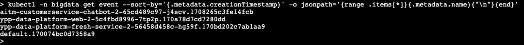 kubectl-n bigdata get event --sort-by='{.metadata.creationTimestamp}' -o jsonpath='{range .items[*]}{.metadata.name}{"\n"}{end}'