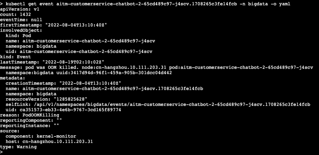 kubectl get event aitm-customerservice-chatbot-2-65cd489c97-j4scv.1708265c3fe14fcb -n bigdata -o yaml