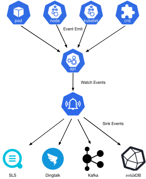 Among them, Kube-eventer is open source from Alibaba Cloud and can be deployed in the Kubernetes cluster in the form of Deployment. Kube-eventer supports offline Kubernetes events to DingTalk robots, Alibaba Cloud log service SLS, Kafka, time series database InfluxDB, Elasticsearch, etc. The architecture is shown in the figure below.