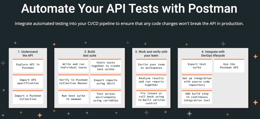 Some people don't want to write code using the same language as developers in the integrated development environment. After all, why force yourself to use the developer's technology stack if the developer doesn't contribute to the automated testing? And the postman is the best option for us.
