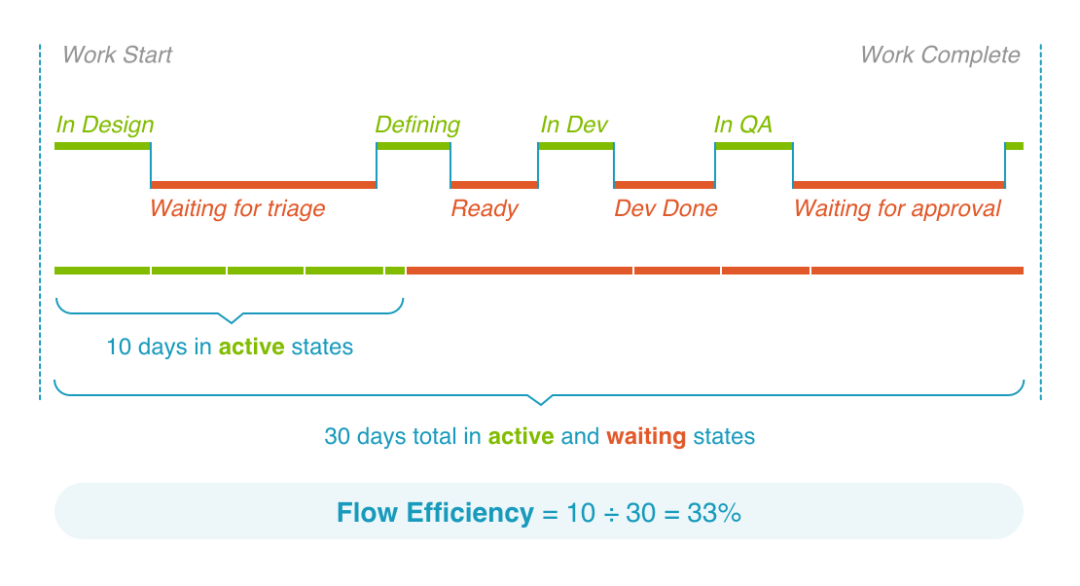 A major part of flow metrics is to track all work involved in planning, building and delivering business products, such as tracking how much value is delivered, how long the work takes and how much Work-In-Progress (WIP), and tracking what work (programming, testing, design and all creative work) is actively being done to determine if its waste and waiting for states hinders value delivery. Flow efficiency is the percentage of the time flow items (features, defects, debts, risks) are actively working on as a percentage of the total time spent in the value stream. If the flow efficiency is low, then the WIP is often in a waiting state for some reason.