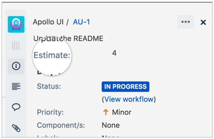 - Estimate each task/Issue: The team often discusses and determines this step in the Backlog refinement meeting. For example, the value of a story is generally estimated using the Fibonacci sequence, 1, 2, 3, 5, 8... In Jira, we directly fill in the corresponding estimate position. The biggest challenge of the burndown chart is how to estimate it! (So here, we have to pay special attention to the estimation)