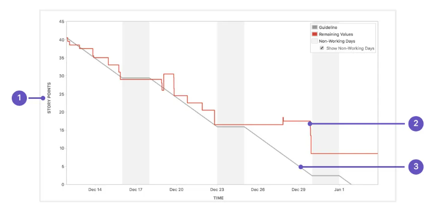 - Actual Remaining Work Curve: This curve is affected by the actual work efficiency of the team, floating above and below the planned curve.