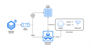 The community considers the Pull pipeline approach a safer practice for GitOps. In this way, the operators are introduced. The operator is a component between the pipeline and the compilation tool. It constantly compares the target state in the environmental repository to the actual state in the deployment infrastructure. If the operator detects any changes, he changes the Infrastructure to fit the environment repository. In addition, you can also monitor the image registry to determine the new version of the image that you want to deploy. That's why GitOps is so special.