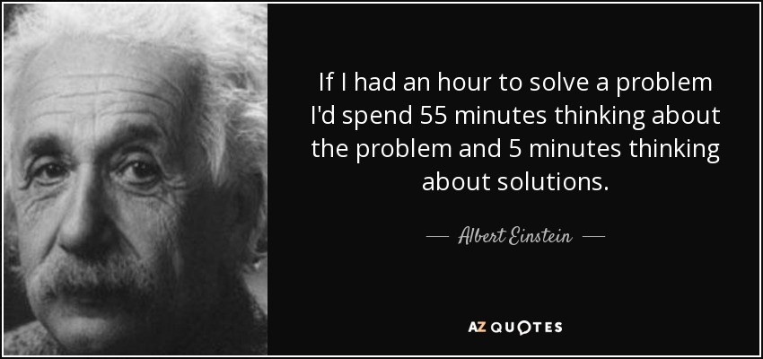 Albert Einstein once said “If I had an hour to solve a problem, I’d spend 55 minutes thinking about the problem and 5 minutes thinking about solutions”.