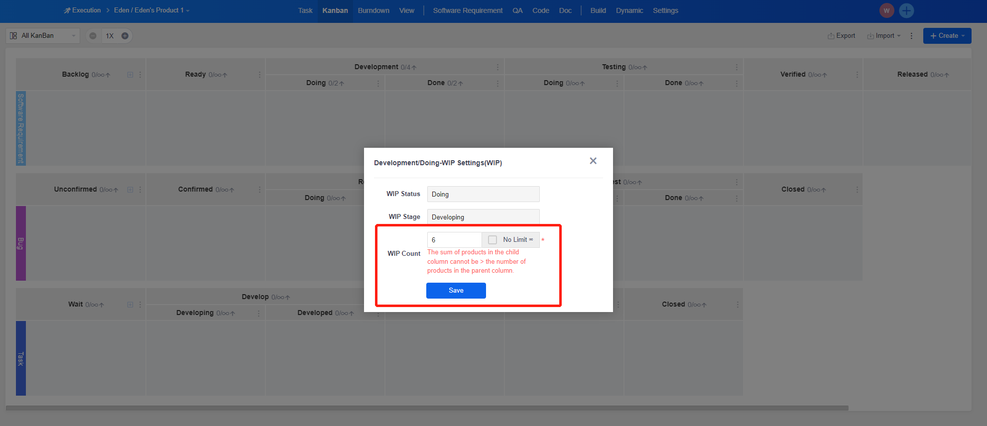 How do I set WIP? The simplest method is derived from the number of team members. Based on the number of team members, multiply by a reasonable parallelism coefficient (the slowest step, the least number of tasks completed in the team) to get the initial limit. This approach is relatively simple, evidence-based, and more acceptable to the team. When the column count exceeds the limit in the Zentao, the column count is displayed in red, indicating that the team needs to make adjustments. The important role of limiting WIP: