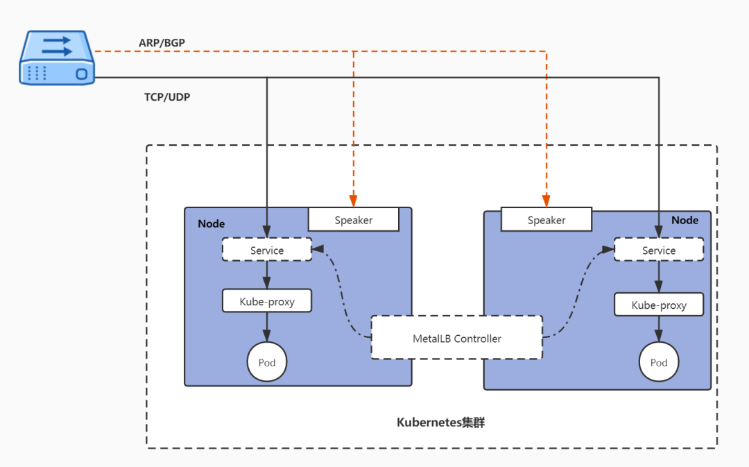 Metalbcontains two components, Controller and Speaker. The Controller is deployed for Deployment, while Speaker is deployed to each node in the cluster in Daemonset mode.