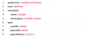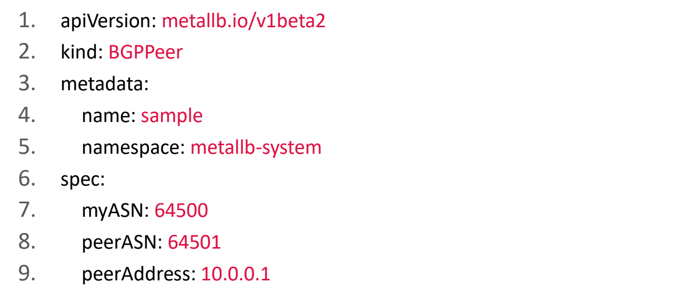 Example: The IP address pool with AS No. 64500 and 192.168.10.0/24 assigned to MetalLB is connected to the router with AS No. 64501 and address 10.0.0.1. The configuration is as follows: