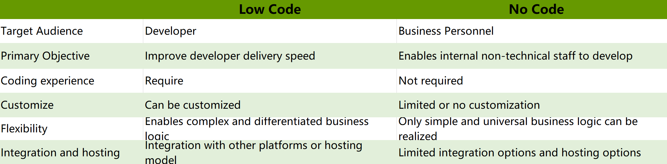Low-code and code-free tools facilitate software expansion and maximize software delivery. The following figure lists the relevant explanations, definitions, and distinctions of low and code-less tools.