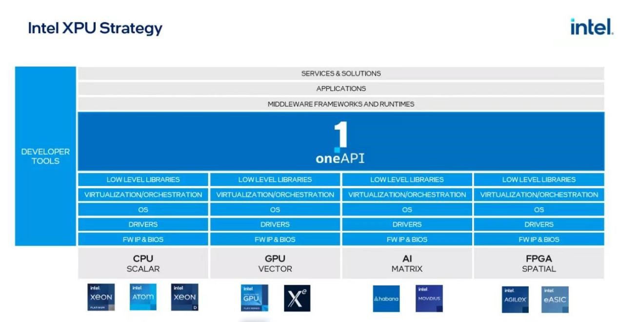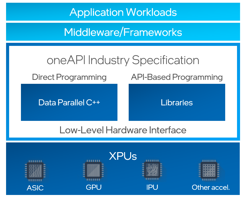 It's not easy, but vendors have taken action and introduced various solutions, among which Intel's oneAPI is worth mentioning. As a unified software programming architecture, oneAPI supports a wide range of heterogeneous computing units, including not only Intel hardware but also hardware from other vendors. At the same time, it offers an open, unified programming language, DPC++. And oneAPI also offers high-performance API-based libraries that can run on a wide range of heterogeneous platforms and deliver extremely high performance, many of which will be open-sourced, offering the possibility of further extensions to add new functionality.