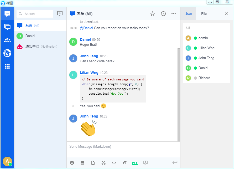 ZenTao has integrated ZenTao Desktop, with which you can communicate with team members, to start a group conversation, to transfer files, to assign tasks, and to manage projects. It would smooth your team collaboration. ZenTao Desktop is powered by Xuanxuan, a free, open source, and secure Instant Messenger by EasyCorp. It is self-hosted and cross-platform with various plug-ins and rich features. Click HERE to know more about it.