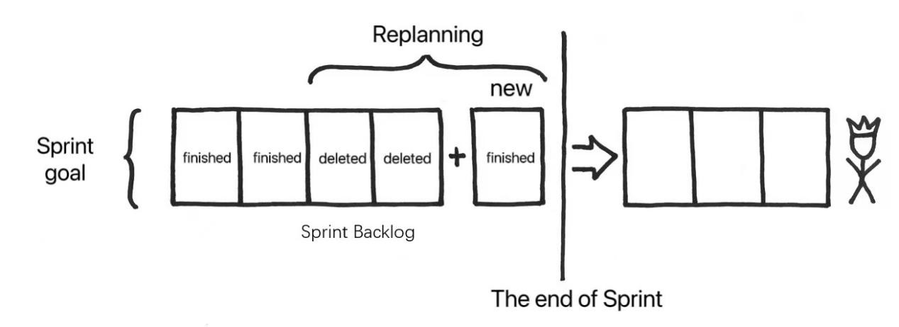 The team may need to re-plan parts of the ongoing Sprint to ensure that the team can deliver value to stakeholders at the end of the Sprint. Over time, the team may gain new insights into the work, and new jobs may be produced, at which the team should adjust the plan accordingly. If the team still follows the original plan, it may not be able to carry out the maximum value. It is also common for teams to be unable to complete each SBI in the Sprint Backlog for more work is required than anticipated, and this may need to be achieved through re-planning if the team still wants to do everything they can to deliver value. Reprogramming Sprint requires thoughtful consideration and takes time.