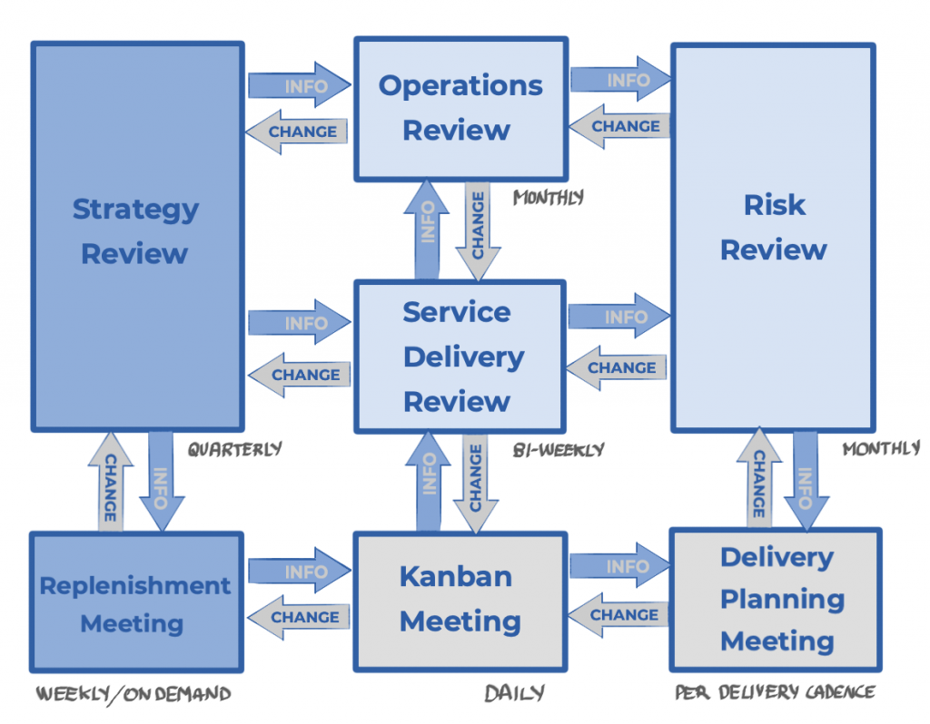 - Service delivery: Kanban Meeting, Replenishment Meeting, and Delivery Planning;