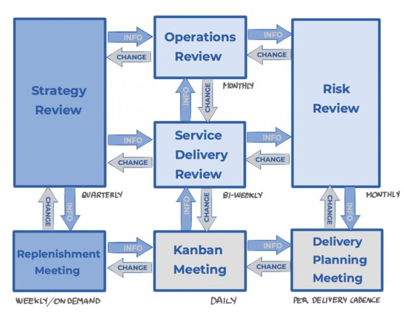 - service delivery: Kanban Meeting, Replenishment Meeting, and Delivery Planning;