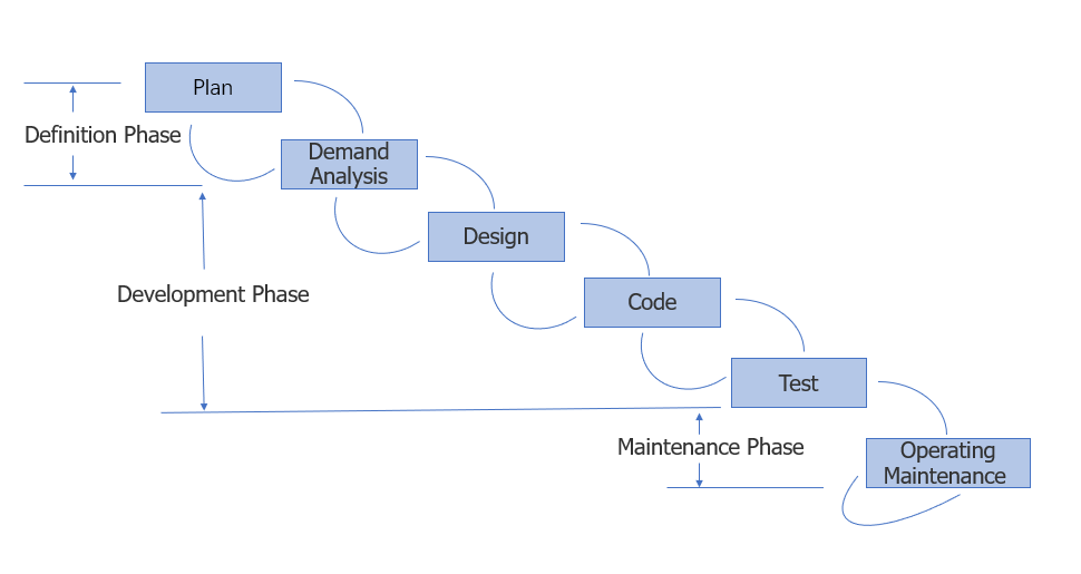 As a popular software development model in the 1970s and 1980s, waterfall connects the whole software life cycle through six processes: planning, requirement analysis, software design, programming, testing, and operation and maintenance. The six processes are in strict sequence, and the following process cannot start until the current one has finished. This top-down flow resembles the fall of a waterfall, hence the name waterfall model.