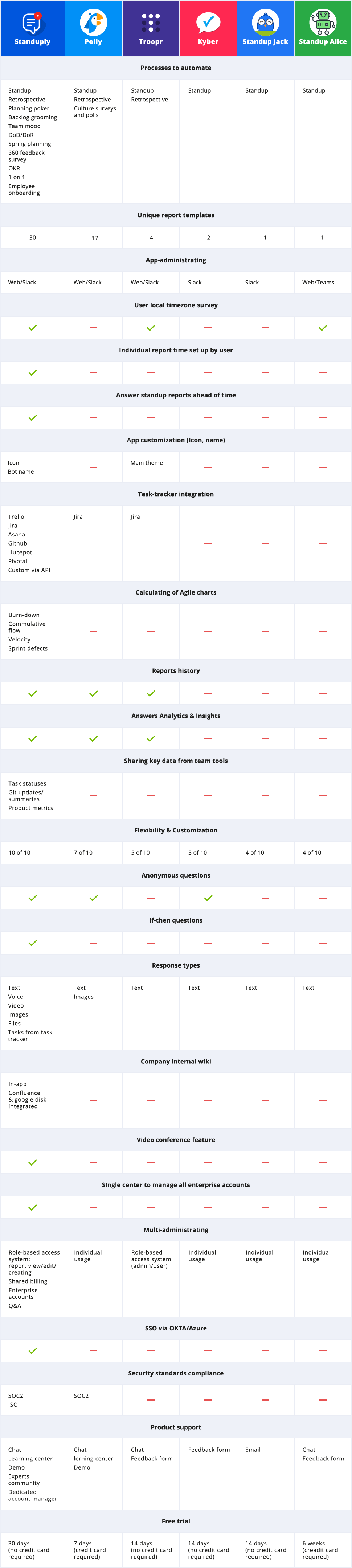If you need concrete examples and more analysis, read also articles on choosing the best bots in 2022 for Microsoft Teams platforms. Or for convenience, see the summary table below with all the top features of the Best Slack Standup bots in 2022.