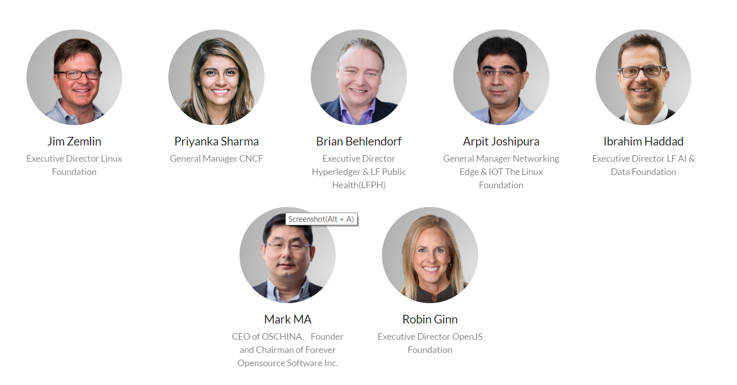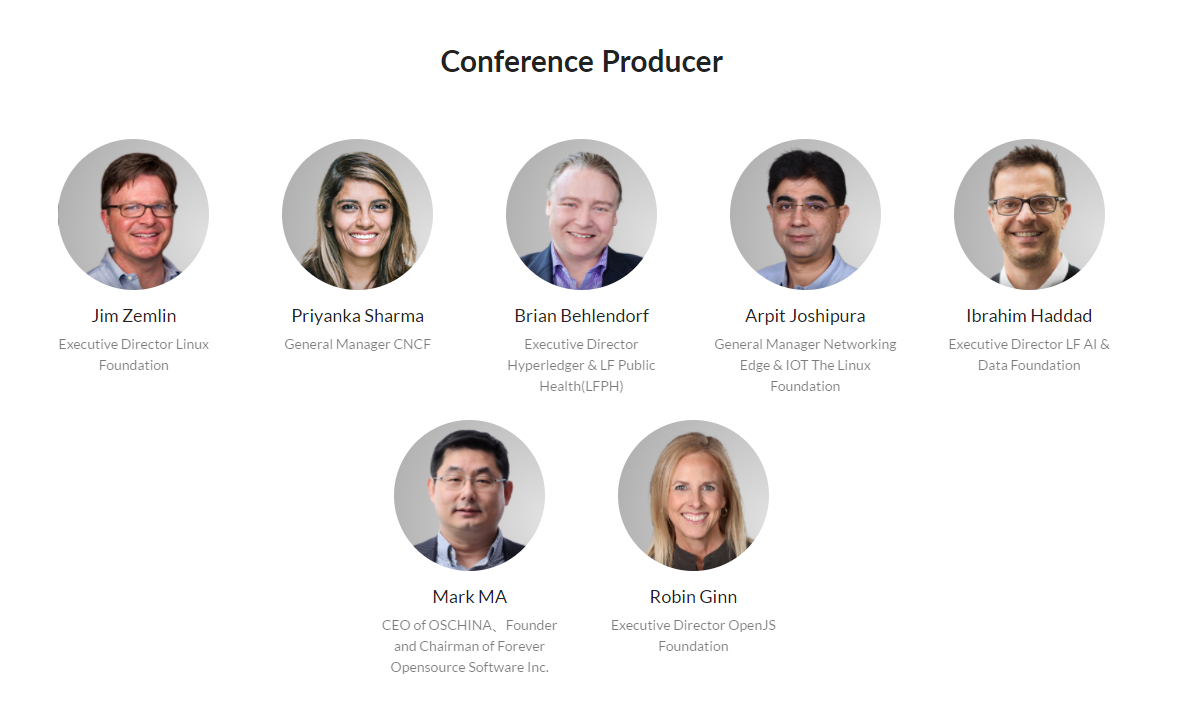 The producer team of The Global Opensource Technology Conference include Jim Zemlin(Executive Director Linux Foundation), Priyanka Sharma(General Manager CNCF), Brian Behlendorf(Executive Director Hyperledger & LF Public Health(LFPH)), Arpit Joshipura(General Manager Networking Edge & IOT The Linux Foundation), Ibrahim Haddad(Executive Director LF AI & Data Foundation), Mark MA(CEO of OSCHINA、Founder and Chairman of Forever Opensource Software Inc.), and Robin Ginn(Executive Director OpenJS Foundation).