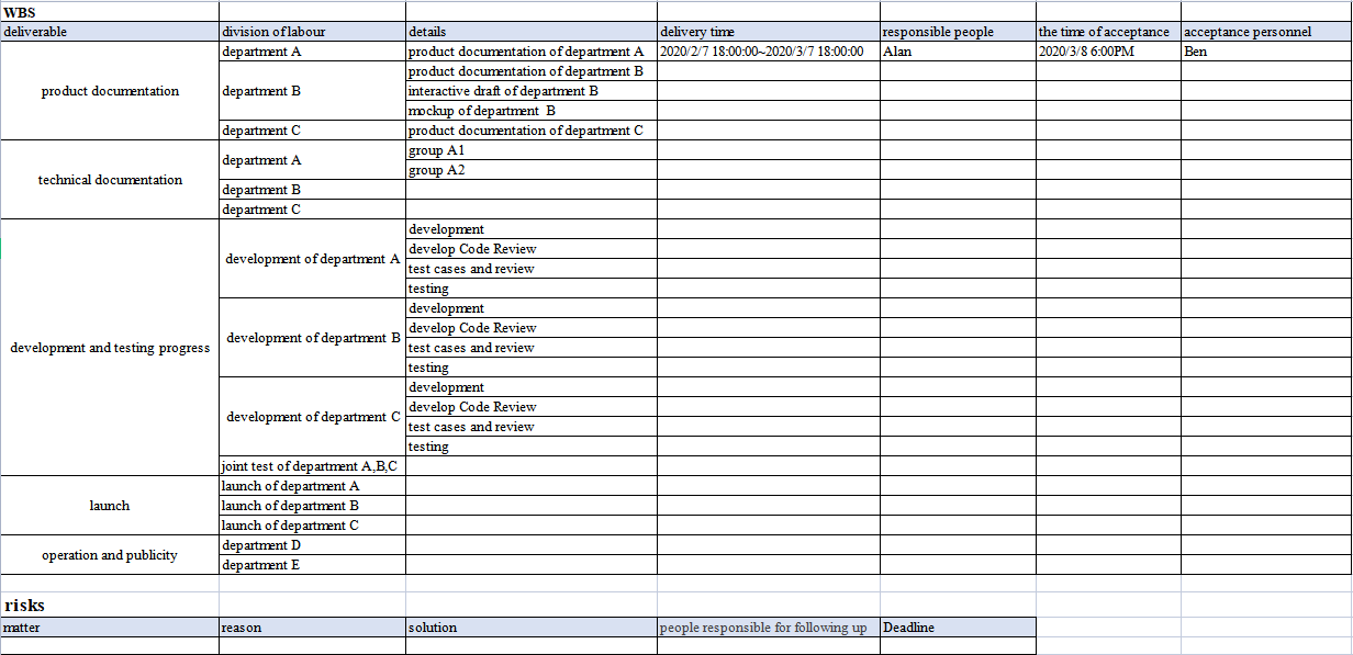 After creating the WBS document, we should hold a meeting to confirm the contents of the WBS document and unify the team goals, hoping the project members develop a clear understanding of their position in the project, the contribution to the overall goal of the project, what is the most important thing for the project, and then make a more accurate judgment of the priority of their work.