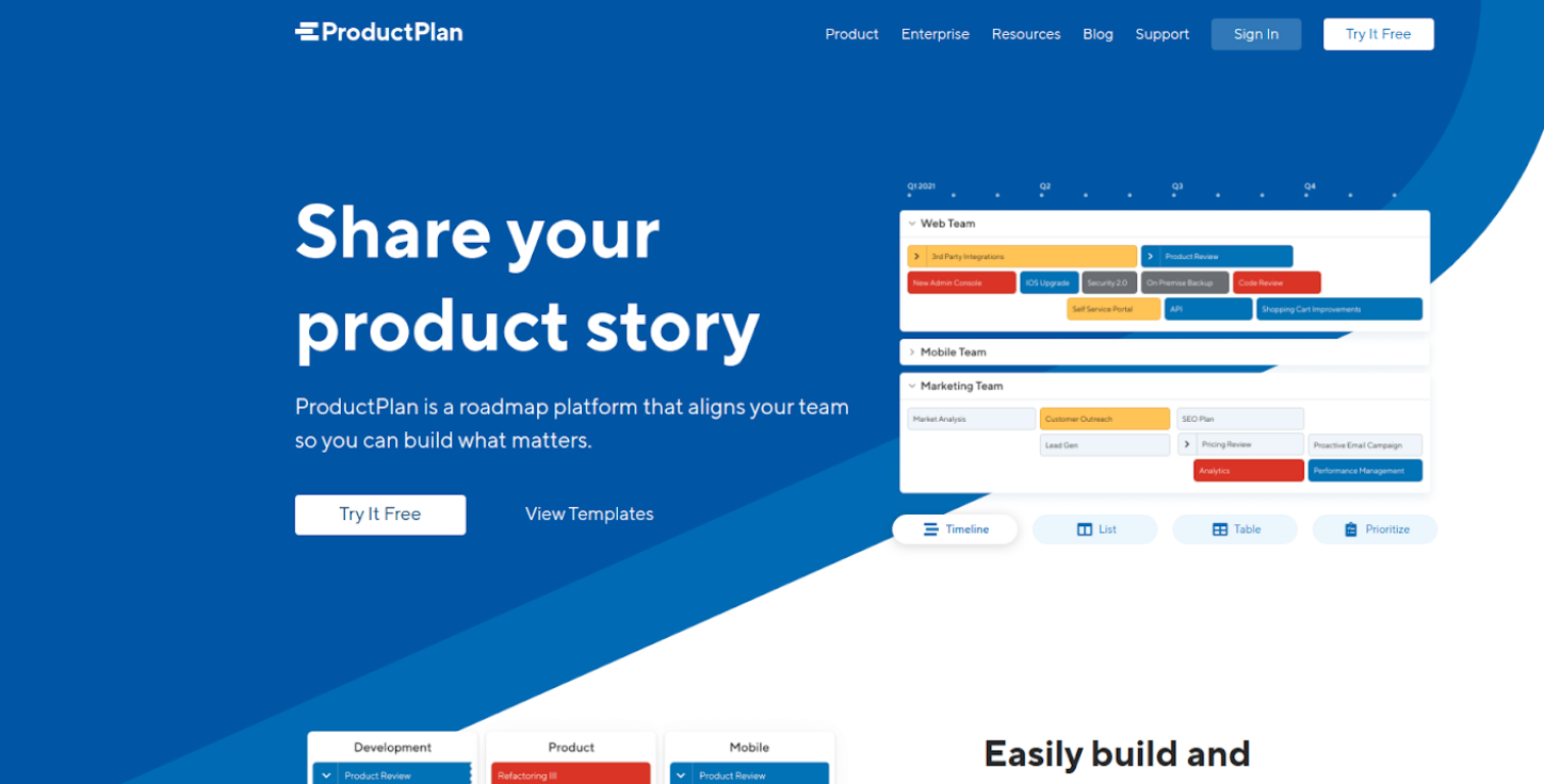 A product roadmap gives the development strategy a direction, to say the least. The product owner, the development team, and the QA team need to continuously collaborate while setting the roadmap and ProductPlan provides just that. ProductPlan provides a flexible, easy-to-use, and collaborative platform to build, edit, and execute product roadmaps. Its visual platform can accommodate your needs no matter how big your team gets.