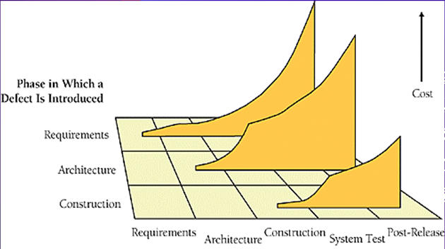 Another underlying logic of the test process: is to form a closed loop. If problems are found in the test process after evaluation, it is necessary to re-analyze, modify the plan, and change the design… After a complete process, a new closed-loop is formed. From the perspective of test process improvement, it also needs to form a closed loop like PDCA. From the perspective of DevOps today, the test is to make users more satisfied, but at the same time, it is necessary to conduct user surveys and collect user feedback to form a closed loop, such as the closed-loop I drew 16 years ago. In terms of the cost of the defect, the earlier the test, the better, because inferior costs grow exponentially.