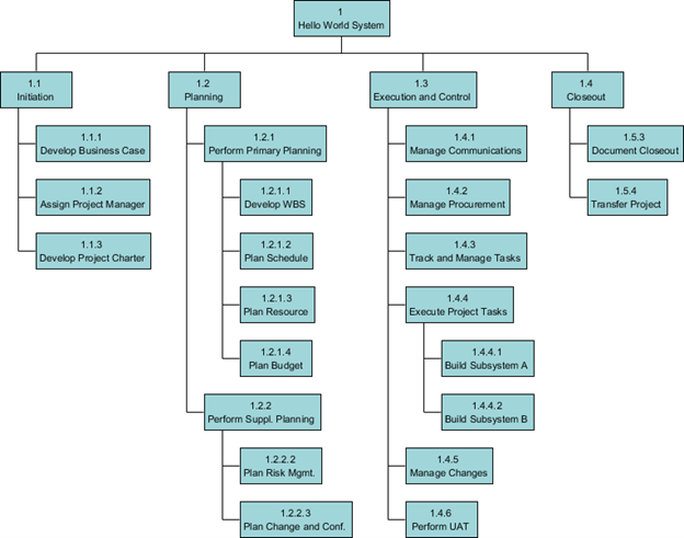 The WBS can be represented by a tree-like hierarchy diagram or a table with indented row beginnings. In a practical application, WBS in the form of a table is widely used, especially in project management software development.