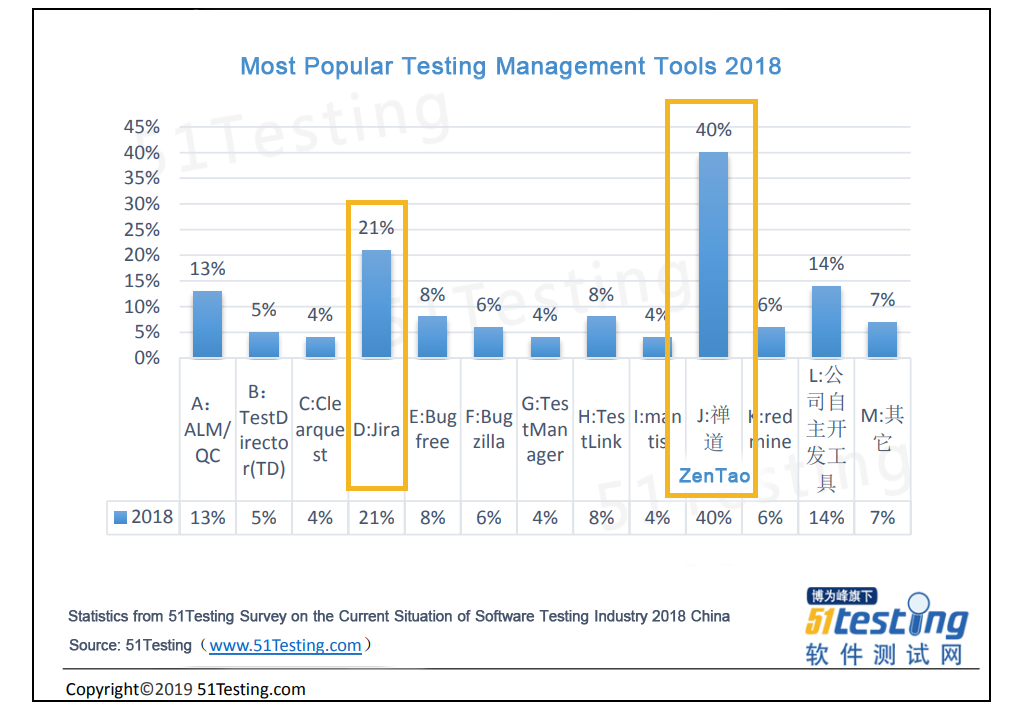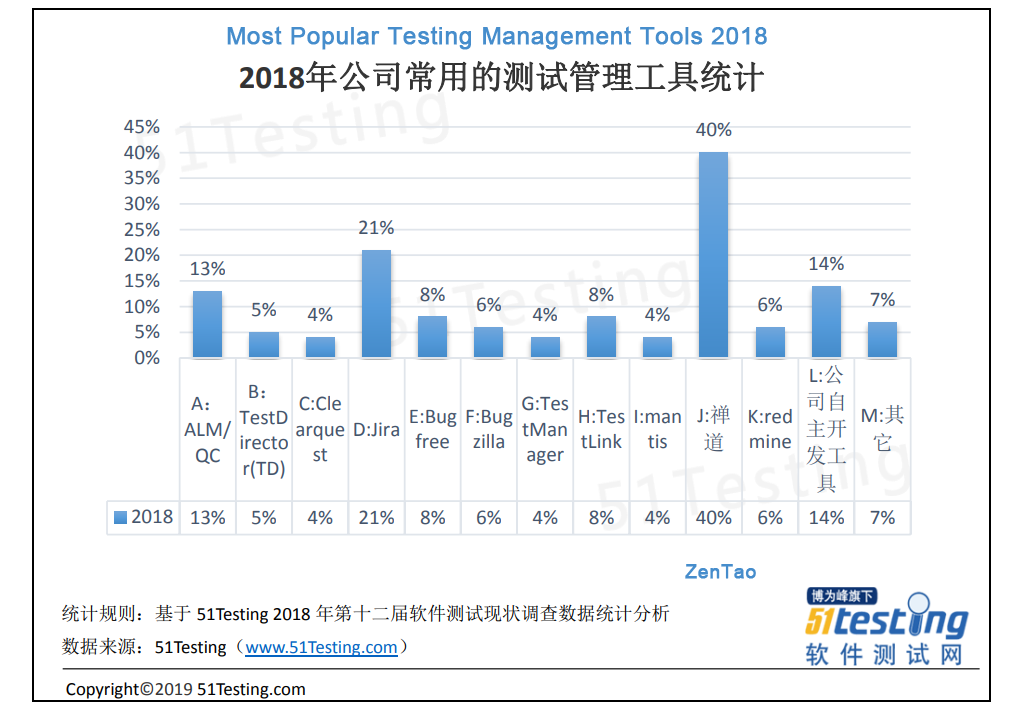 According to the survey by 51testing.com, ZenTao, with 40% market share in testing management tools, is the most popular tool in China for the last year. 51testing.com is a professional software testing service provider which provides the overall solution of software testing for enterprises, trains excellent software testing talents for the industry, and provides an open platform for software testing and collaboration.