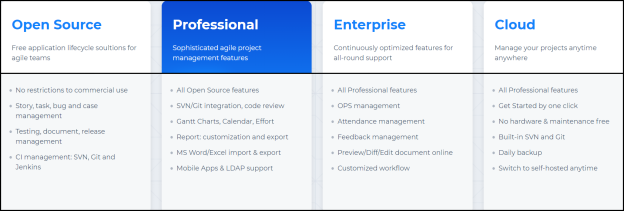 ZenTao offers four different plans to the clients with varied features in which can be understood from the image displayed below:About GoodFirms