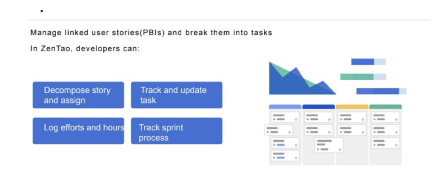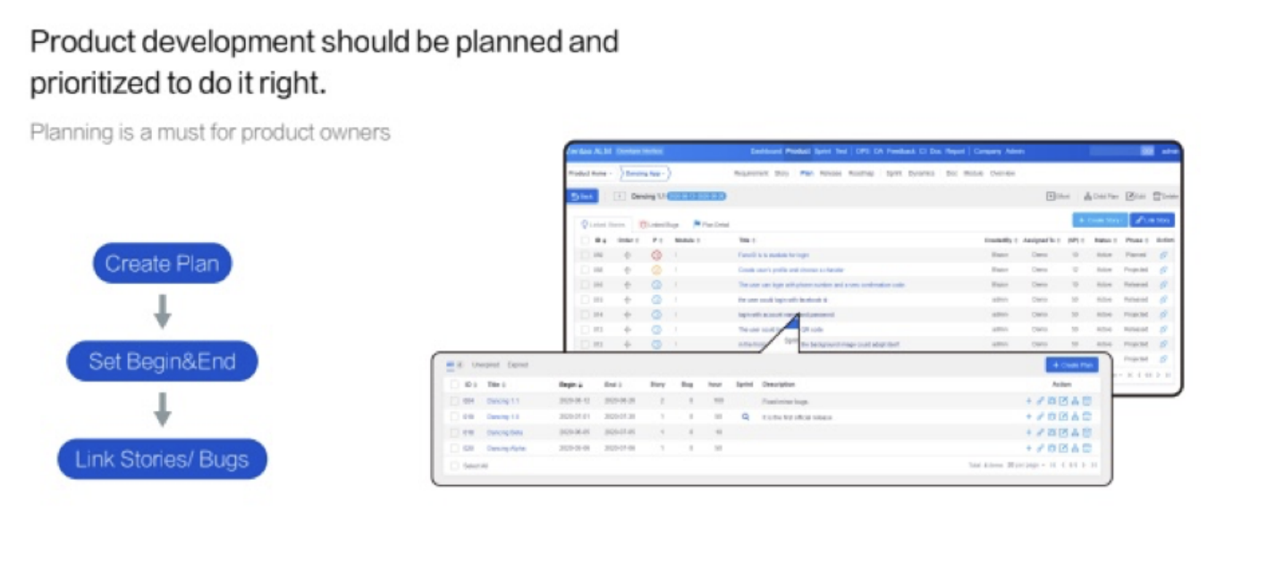 Plan and track your work : Scrum, Kanban, LeSS, SAfe, blended approach, ZenTao allows agile teams to plan their sprints and activities, track their project progress, make necessary adjustments, collaborate on documents with a modern and easy-to-use interface