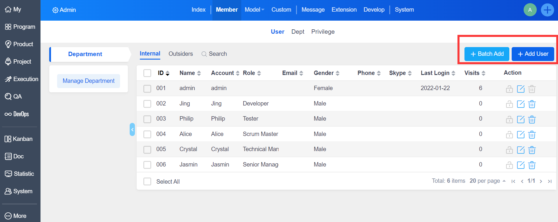 The Administrator can add users in the Admin--Member--User. Managing the user's department structure and assigning Privilege to them.