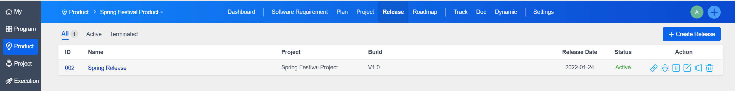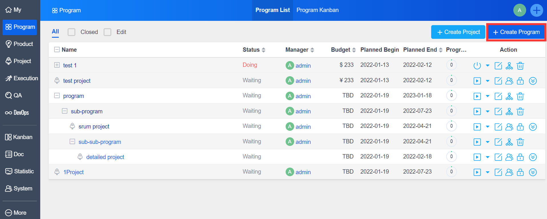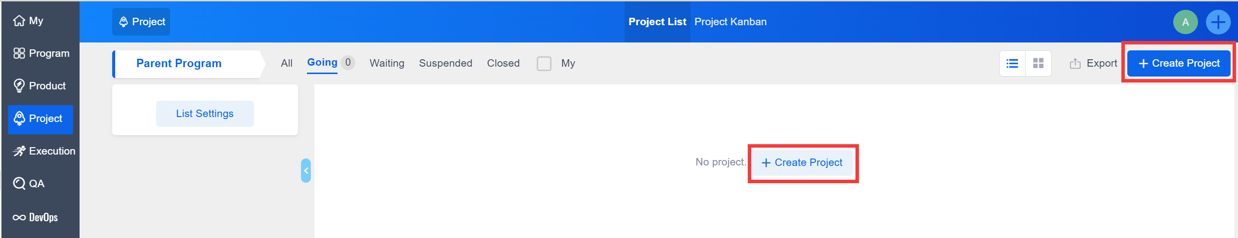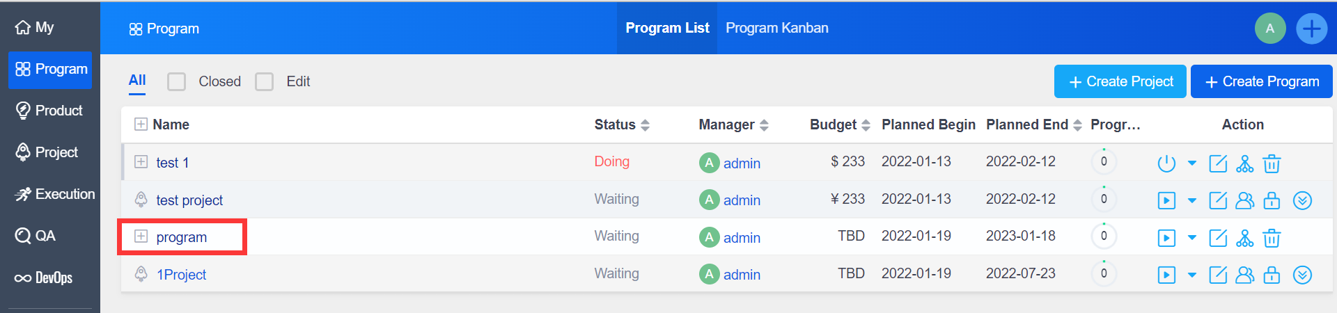 After the project is created successfully, you can view the relationship between Project, Product, Program through the Program that the Project belongs to.