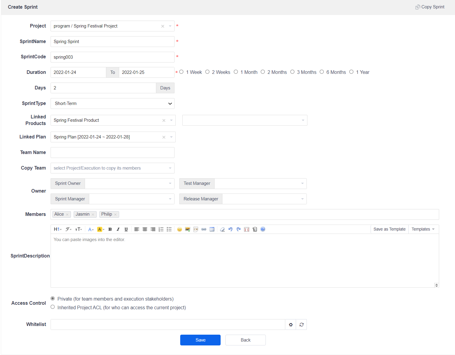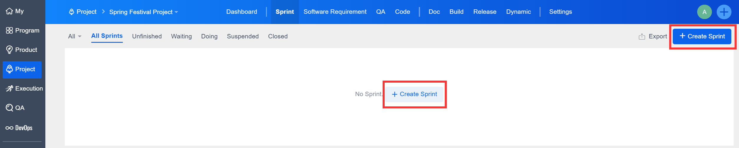 Click the Create Sprint/Iteration button on the right top corner of the Project--Sprint Page.