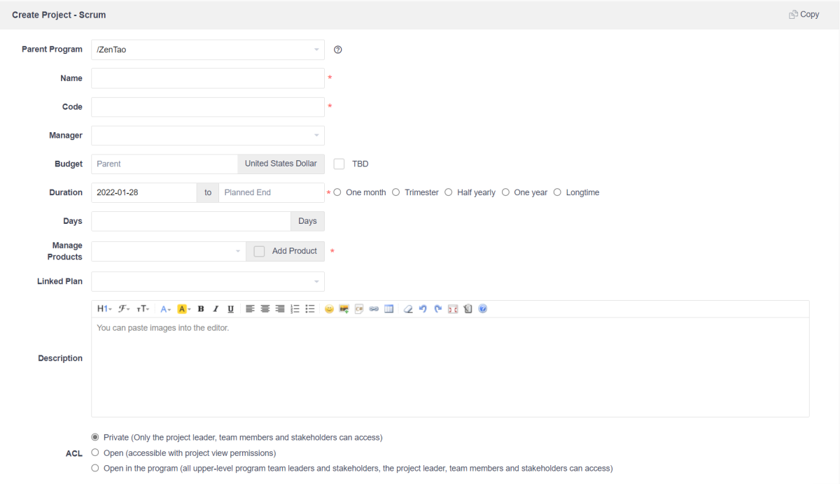 After entering the Create Project page, first enter the choice of project management method: Scrum or Waterfall project.