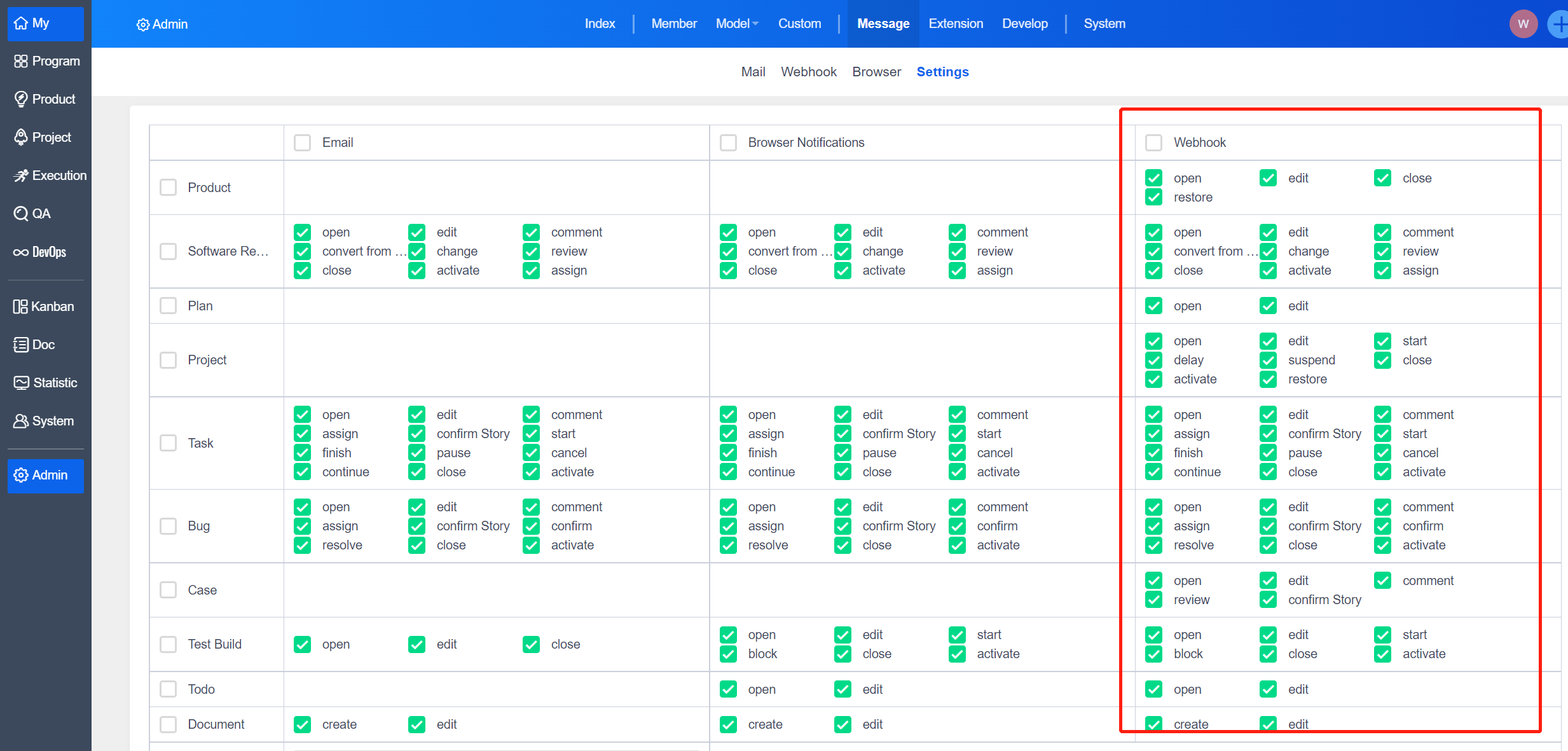 The administrators go to the background of ZenTao - "Message" - "Settings" - "Client" to check the operations that need to send a reminder. After that, the user performs these operations in ZenTao, and the assignee can receive alerts on the Desktop.