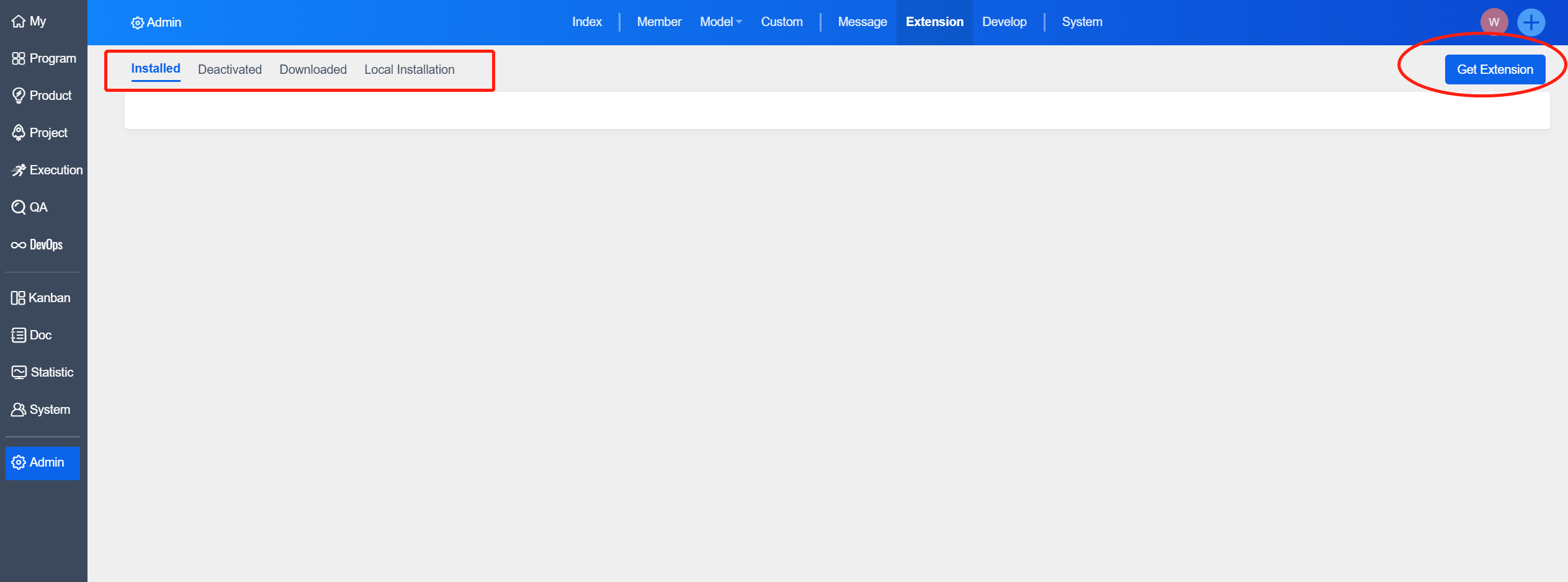 1). Click "Admin" - "Extension" - "Get Extension".