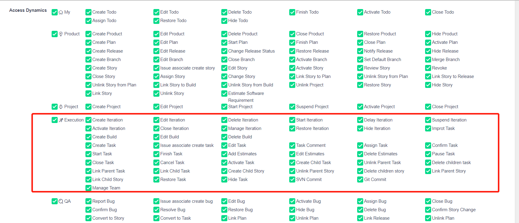 The privilege management page of the execution sight: checked to assign permissions, unchecked it to not assign permissions.