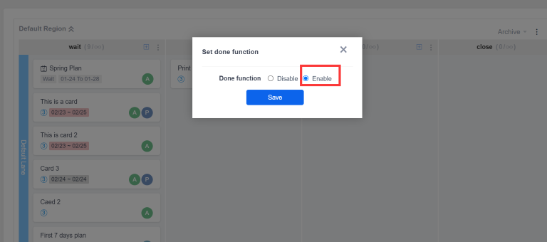 Cards in the General Kanban support completion and activation operations, and are not bound to the column status, but simply identify whether the card is completed.