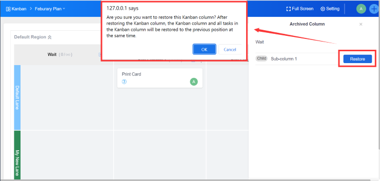 Click "More" -> ''Archive Column'' in a sub-column, there will be a reminder popped out "Are you sure to archive this column? After archiving the column, the column and all cards in the column will be hidden. You can view the archived columns in the Region - Archived."
