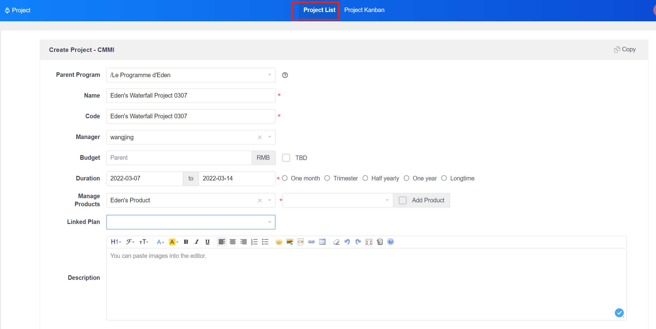 The page for creating a waterfall project is basically the same as the page for creating a Scrum project. Fill in the information and click Save.