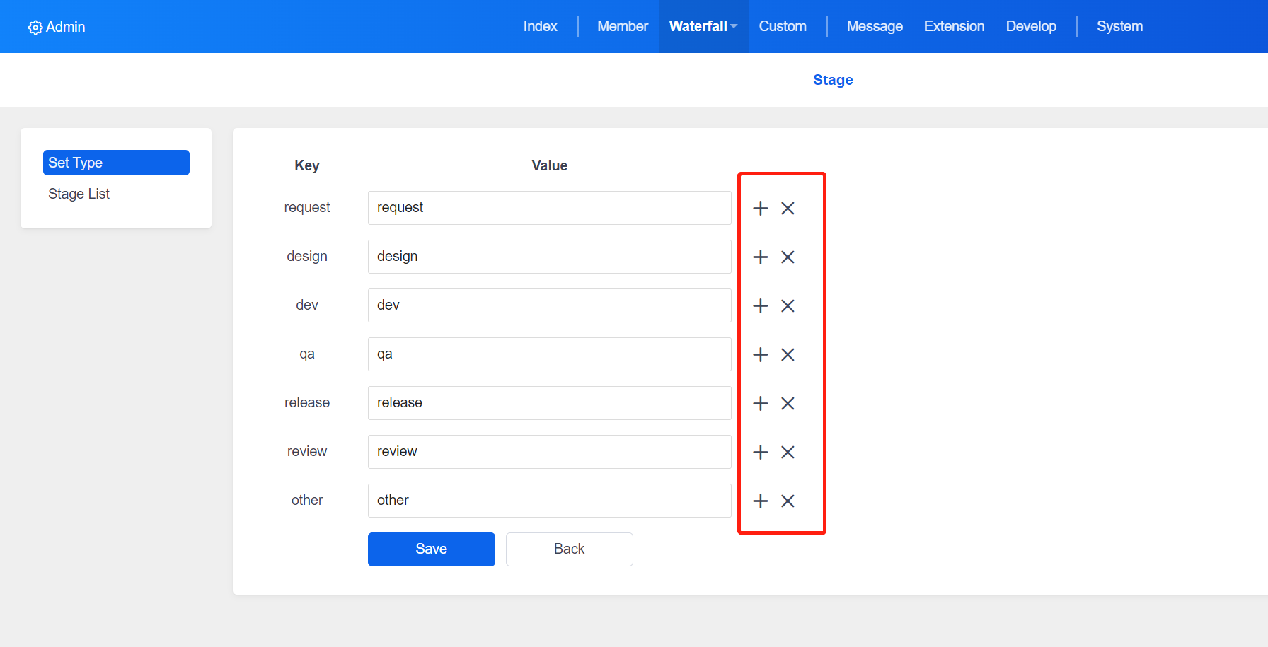 You can go to the "Admin" - "Waterfall" to customize the stage type according to the actual work needs. You can modify the original stage type, or delete the original stage type and add the stage type you actually require.